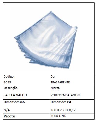 SACO A VACUO 180X250 X 0,12 PCT 1.000UN